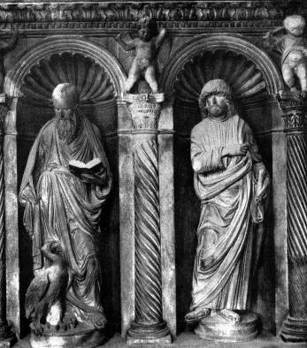 Некоторые крупные скульпторы далматинского происхождения получили в это время широкую известность, работая за пределами родной земли. Таков, например, Иван Дукнович из Трогира, более известный под именем Джованни Далмата (род. ок. 1440 г., ум. после 1509 г.). В 1470-х гг. он работал в Риме, создав, в частности, вместе с Мино да Фьезоле надгробие папы Павла II. С 1481 по 1490г. он находился при дворе венгерского короля Матьяша, став одним из крупнейших деятелей венгерского Возрождения. Работал он и на родине. В 1470-е гг.— время расцвета творчества Дукновича — создано одно из лучших его произведений — статуя Иоанна Богослова для капеллы Иоанна Урсини в Трогирском соборе, соседствующая с фигурами апостолов, которые были исполнены здесь несколько лет назад Николаем Флорентинцем и Андреем Алеши. В сравнении с последними Дукнович представляет собой мастера, ушедшего далеко вперед как в овладении языком скульптуры, так и в постижении многогранности человеческого образа. Для его манеры характерна сочная пластика скульптурной формы и как бы порожденная внутренней взволнованностью его героев трактовка одежды, падающей крупными динамическими складками. Другая статуя — апостола Фомы, созданная Дукиовичем в той же капелле, относится к последним годам жизни скульптора и отмечена некоторой упрощенностью замысла, более сухой и графической манерой.
