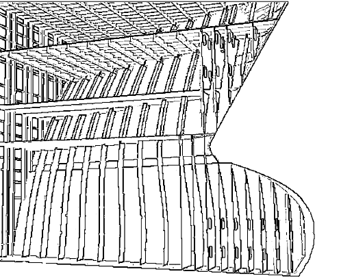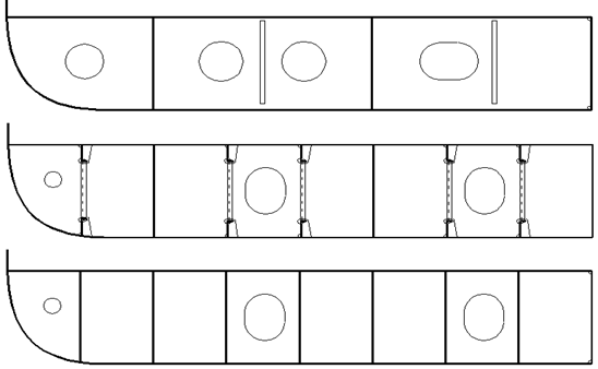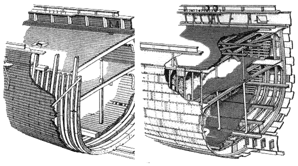 Достоинством поперечной системы набора является также возможность при работе шпангоутов использовать арочный эффект. При криволинейных обводах шпангоуты под действием поперечных нагрузок обладают большей прочностью, чем при плоских. Особенно это сказывается в оконечностях, где напряжения от общего изгиба небольшие, а шпангоуты опираются на ряд горизонтальных платформ. Поэтому здесь предпочтение отдается поперечной системе набора даже на судах длиной значительно больше 100 м. Кроме этого, прочность носовой оконечности на динамические нагрузки от ударов о волны и лёд проще обеспечивается при поперечной системе набора. До конца XIX века морские корабли и суда строили только по поперечной системе набора (см. рис. 2.2).