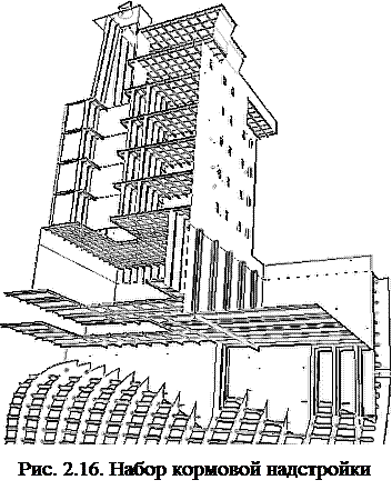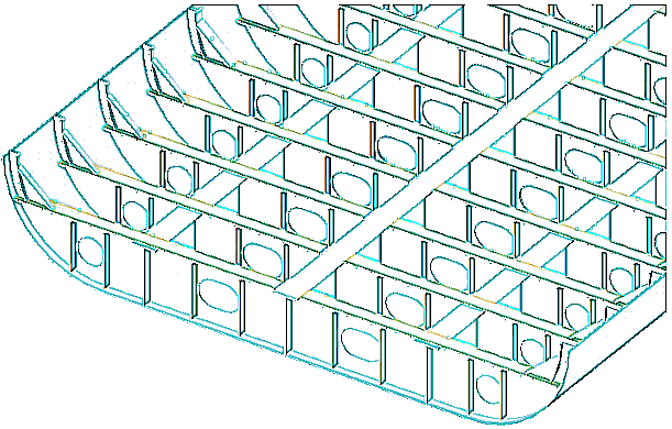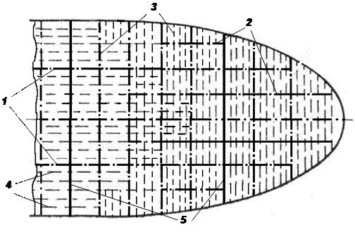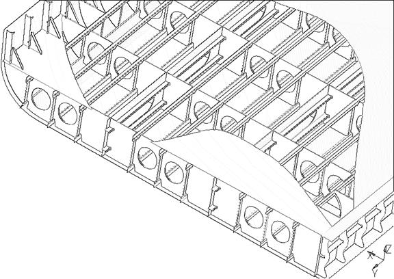 Клетчатая система набора обычно используется для создания повышенной местной прочности при ударных нагрузках. Такие нагрузки действуют при ударах носовой оконечности о воду, ударах волн в развал борта, а также при движении судна во льдах и при ударах грейферами о днище во время грузовых операций. Такая система обеспечивает повышенную жёсткость и меньшие амплитуды местной вибрации, что объясняет её частое применение в конструкциях машинного отделения и кормовых надстроек (рис. 2.16).