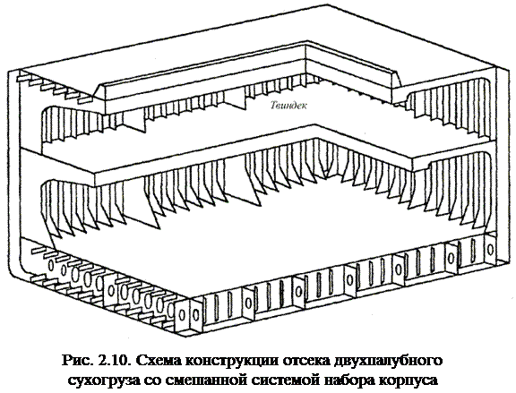 Система набора корпуса судна в целом определяется системами набора перекрытий днища, бортов и палуб на большей части корпуса (кроме оконечностей). Если эти перекрытия имеют разные системы набора, то система набора судна в целом называется смешанной. В наиболее распространённом варианте смешанной системы набора корпуса судна борт имеет поперечную систему набора, а верхняя палуба и днище – продольную (рис. 2.9, 2.10).