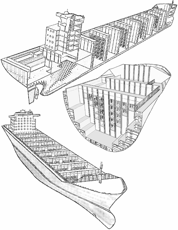 Рис. 5.16. Носовая оконечность и средняя часть контейнеровоза
