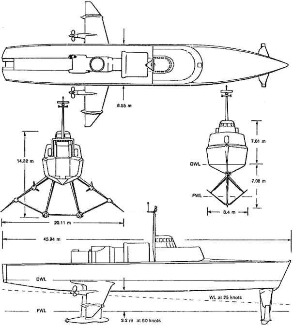 управляемые с помощью электроники, расположены по схеме «утка». Они могут быть подняты из воды при движении в водоизмещающем режиме)