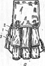 | Рис.22. Сумка для переноски выстрелов: а – вид в закрытом положении; б – вид в открытом положении; 1 – плечевой ремень; 2 – ручка; 3 – плечевая подушка; 4 – противотанковая граната; 5 – пенал со стартовым пороховым зарядом. |