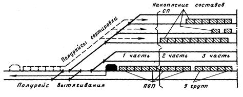 , а затем тормозят до скорости 4-5 км/ч. Первый и затем второй отцеп уходят на пути сортировочного парка. Так, без оттягивания назад, в сортировочный парк направляется серия отцепов. После оттягивания вновь повторяется технология работы, аналогичная первой серии.
