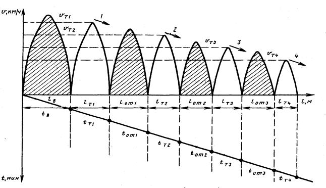 На рис. 5.5 приведена диаграмма выполнения маневров изолированными толчками для случая, когда скорость каждого последующего толчка меньше, чем скорость предыдущего, учитывая, что расстояние следования последующих отцепов сокращается в связи с заполнением сортировочных путей вагонами в процессе расформирования; Как видно из диаграммы, каждый полурейс толчка отделен oт последующего и предыдущего полурейсов и оттягивания (толчки как бы «изолированы» друг от друга). Термин «маневры изолированными толчками» является условным.