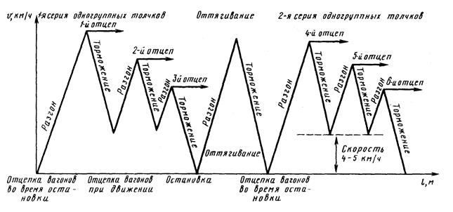 после каждого отцепа, как правило, сокращаются. Однако, если путь следования отцепа большой, полурейс оттягивания делается с тем расчетом, чтобы было достаточно расстояния для разгона и набора достаточной скорости толчка. Скорости толчков неодинаковы, и скорость последующего толчка может быть больше скорости предыдущего.