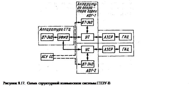 Во взаимосвязи АЗСР и ГДЦ на автоматизированных горках применяются ГПЗУ. Так, например, устройство ГПЗУ-В построено на базе видеотерминала (дисплея) «Видео-тон-340». Аппаратура ГПЗУ-В установлена у оператора СТЦ и оператора горки, Аппаратура оператора горки содержит дисплей ВТ-340, устройство сопряжения (УС), которое принимает содержание сортировочного листа (программу роспуска) из ВТ-340, преобразовывает ее и передает в систему АЗСР. В СТЦ установлен ВТ-340, на котором оператор набирает программу роспуска, и устройство формирования и индикации вызова (УФИВ), которое формирует сигналы вызова к аппаратуре оператора горки и обеспечивает индикацию при поступлении сигнала вызова от оператора горки. УФИВ коммутирует каналы подключения ВТ-340 СТЦ и каналы связи комплектов аппаратуры на горке. Структурная схема системы ГПЗУ-В при работе на горке двух операторов по двум путям надвига (аппаратура ОГ1 и ОГ2) приведена на рис. 8.17.