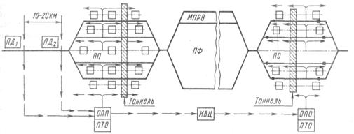 На рис. 14.2 показана схема размещения в парках приема и отправления сортировочной станции тележек для осмотра и ремонта вагонов, а также устройств для автоматического соединения рукавов, тоннелей для перехода через пути и другого оборудования. Для механизации труда работников ПТО предусмотрены два поста диагностики вагонов ПД в движущихся поездах. Первый пост размещается на расстоянии 10-12 км от узловой сортировочной станции. Здесь размещается