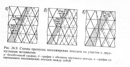 Пропуск пассажирского поезда на участке с двухпутными вставками вызывает сдвижку моментов безостановочных скрещений поездов (рис. 26.9)