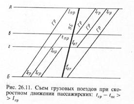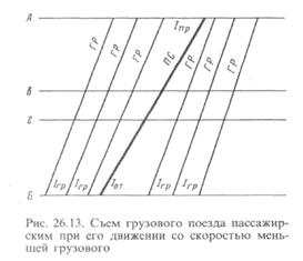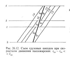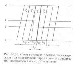 (рис. 26.10). Это участок с практически параллельным графиком. Обгоны грузовых поездов пассажирскими в этих условиях нецелесообразны. Время съема определится: