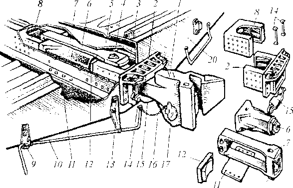 Корпус 7 автосцепки с деталями механизма установлен в окно ударной розетки 2 и своим хвостовиком соединен с тяговым хомутом 7 при помощи клина 4, который вставляется снизу п опирается на 2 болта 18, закрепленных запорными шайбами и гайками. Расцегшой привод укреплен па концевой балке 20 рамы. Он состоит из двуплечего рычага 10, кронштейна с полочкой 9, державки 13 и цепи 16 для соединения рычага 10 с приводом механизма автосцепки 17. Ударно-центрирующий прибор состоит из ударной розетки 2, прикрепленной в средней части к концевой балке 20 рамы, двух маятниковых подвесок 14 и центрирующей балочки 15, па которую опирается корпус автосцепки 1.