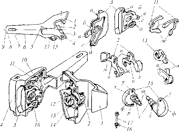 Перед сборкой осматривают карман корпуса, где не должно находиться посторонних предметов и грязи. После этого подъемник замка 13 укладывают на опору 14, расположенную внизу па правой стенке кармана так, чтобы широкий палец о находился вверху и был направлен в сторону зева. Затем па тип 12, находящийся внутри кармана с правой стороны, навешивают овальным отверстием и замкодержатель 2 так, чтобы его лапа к выступала в зев. На шип а замка 3 надевают предохранитель 11 таким образом, чтобы его нижнее плечо ж находилось в вырезе замка. Замок вместе с предохранителем вводят внутрь корпуса и укладывают на дно кармана так, чтобы его направляющий зуб д вошел в специальное отверстие. При этом следят за чем, чтобы верхнее плечо е предохранителя 11 обязательно было уложено на полочку 10.