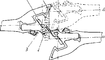 | Рис. 3.50. Положение деталей механизма автосцепки; и — перед сцеплением; б — сцепленных автосцепок |