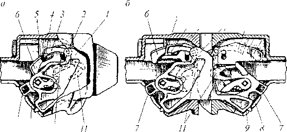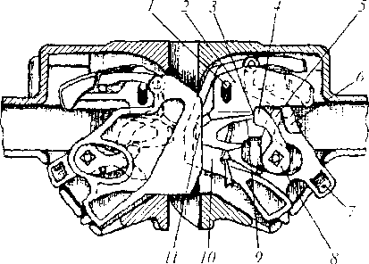 В этих случаях каждый из замков 1 (рис. 3.50, а) начинает свободно входить внутрь кармана корпуса, так как верхнее плечо 3 предохранителя, навешенного па шип 2 замка /, скользит по полочке 4 и проходит над упором 5 противовеса 6 замкодержателя. Продвигаясь дальше в зевах, малые зубья перемещают внутрь кармана замки 1, которые перекатываются своей дуговой опорой 9 по наклонному дну кармана 8. Сигнальный отросток 7 при этом выходит из корпуса. Одновременно малые зубья нажимают на лапы 11 и утапливают их. поворачивая замкодержатели вокруг шипов 10, расположенных на вертикальных стенках внутри кармана.