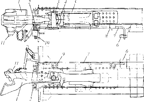 При этом противовесы 6 поднимаются и становятся упорами для верхнего плеча 5 предохранителей. Когда малые зубья полностью утопят выступающие части замков 1 и лапы 11 замкодержателей, они начнут скользить по направляющим ударным поверхностям зева и занимать крайнее положение в упор к большим зубьям.