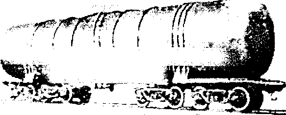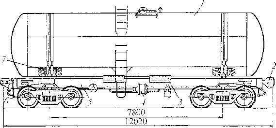 | Рис. 4.3. Четырехосная цистерна грузоподъемностью 60 т: / - - котел; 2 — автосцепное устройство; 3 — крепление котла к рамс; 4 — тормозное оборудование; 5 — рама; 6 — тележка; 7—опора котла на раму |