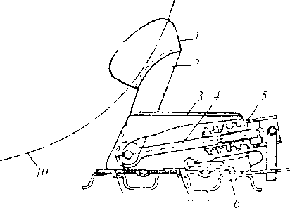 | Для обеспечения необходимой устойчивости вагона от поперечною опрокидывания под воздействием центробежной силы в кривых участках пути и давления воздуха при повышенном центре массы груженого вагона и увеличенной боковой поверхности кузова, в хребтовой балке вблизи шкворневых балок в средней части ее размещены балластные грузы общей массой 2,7 т. Для закрепления автомобилей от продольного и поперечного смещений по рамам ярусов вагона имеются съемные колесные упоры, которые размещаются в щелевых пазах в металлических гофрированных листах, приваренных к рамам ярусов вагона. Колесный упор (рис. 4.8) состоит из корпуса 3, внутри которого находятся винт 4с регулировочной гайкой и закидка 6, винт 4 шарнирно соединен с рычагом 2, заканчивающимся башмаком /, на который в прижатом состоянии опирается колесо 10 автомобиля. |
