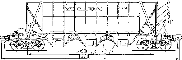 Специализированный вагон-хоппер модели 19-752 для перевозки зерна (рис. 4.10) имеет цельнометаллический кузов с разгрузочными люками бункерного типа 11 с механизмами 12 для открывания и закрывания крышек 13 люков. Кузов вагона состоит из рамы 8, боковых 5