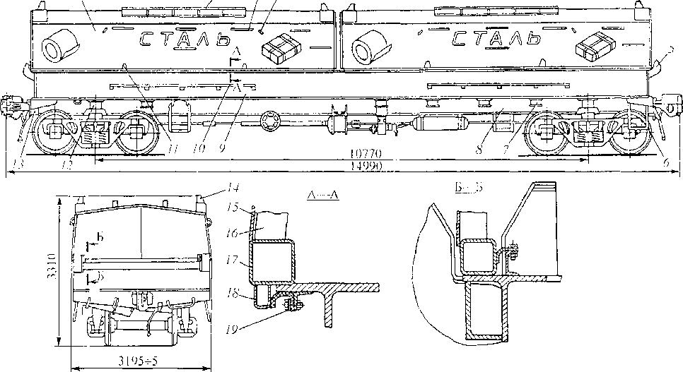 Специализированный крытый вагон модели 12-4011 (рис. 4.11) грузоподъемностью 64 т для перевозки холоднокатаной стали в рулонах или пакетах имеет кузов с двумя съемными кожухами 7, изготовленными из гладких листов 15 толщиной 3 мм, дуг 16 верхней и нижней продольных обвязок 17, упор 18 и резиновые уплотнительные элементы 19.