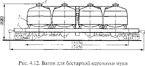Кузов специализированного крытого вагона модели 17-486 (рис. 4.12) для бестарной перевозки муки состоит из рамы 7, в средней части которой хребтовая балка рамы отсутствует, и укрепленных на ней четырех бункеров 2 коническо-цилиндрической формы с наружным диаметром 3220 мм, изготовленных из алюминиевого сплава марки АМГ6 или марки 1915.
