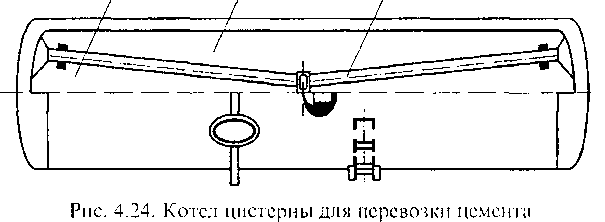 Котел цистерны для перевозки цемента (рис. 4.24) отличается тем, что для облегчения выгрузки цемент взрыхляют сжатым воздухом (избыточное давление 0,2 МПа), который подводится к желобам (аэролоткам) I и шлангу, присоединенному к разгрузочному устройству 2, для лучшего подвода цемента к которому имеются рассекатели 4 и боковые