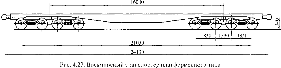 Рама восьмиосного транспортера платформенного типа (рис. 4.27) сварной конструкции состоит из четырех двутавровых балок, к которым приварен металлический пол с рядом отверстий для крепления перевозимого груза. Для этой же цели предусмотрены кронштейны двутавровых балок рамы транспортера.