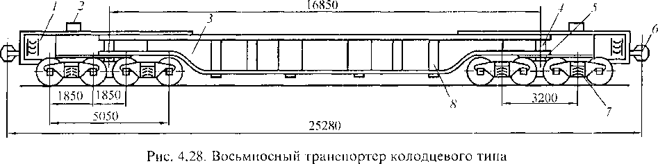 Рама с главной несущей балкой 3 транспортера колодцевого типа (рис. 4.28) через сферические пятники 5 и продольные концевые балки 1 опирается на тележки 7. На балках 1 размещены автосцепка 6 и оборудование автотормоза 2. Колодец (пустота) несущей балки 3 имеет длину 10,8 м сверху и 10,0 м внизу и ширину 2,42 м. Транспортер имеет четыре съемные поперечные балки 8, которые в зависимости от размеров перевозимых грузов можно переставлять, опирая на различные пары подушек.