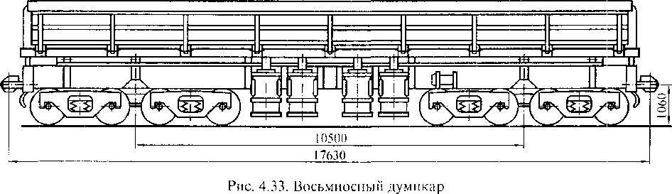 Восьмиосные думпкары с двумя четырехосными тележками (рис. 4.33) служат для перевозки вскрышных пород с удельным весом до 2,0 т/м3 и скальных пород и руд с удельным весом до 2,5-3,0 т/м3 на предприятиях горной металлургии. Кузов думпкара имеет такую же принципиальную схему, как у шестиосного думпкара; отличия лишь в конструктивном исполнении отдельных узлов и деталей.