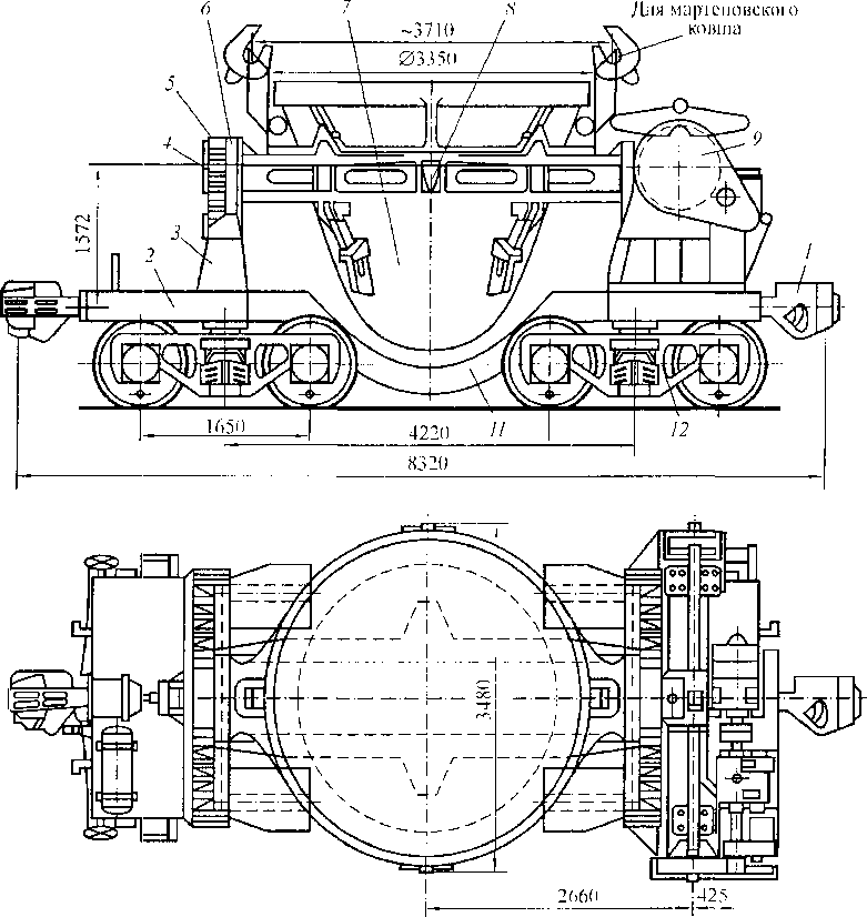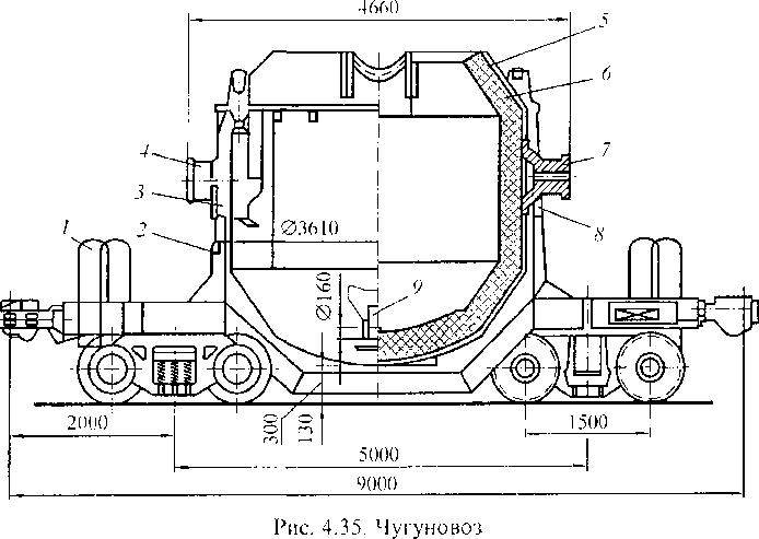 Для перевозки жидкого чугуна применяется чугуновоз (рис. 4.35), состоящий из лафетов со стойками 2 для ковша, упоров 1 для правильной установки чугуновоза под погрузку и выгрузку. Ковш имеет цапфы 3, 4, 7 и 8, крановые захваты 9 для поворота ковша и футеровку 6 из огнеупорного кирпича толщиной 310 мм.