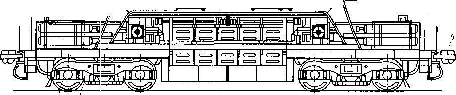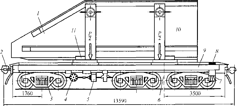 Транспортер площадочного типа с пониженной средней частью грузовой рамы для перевозки грузов большой высоты (рис. 4.29) имеет несущую балку 3 из пяти двутавров, поперечных балок 4 и стального листа 11 толщиной 20 мм (настил пола), опирающуюся на четырехосные тележки 5 через плоские пятники 6. На концевых балках 1 расположены тормозные будки и типовые автосцепки 7.