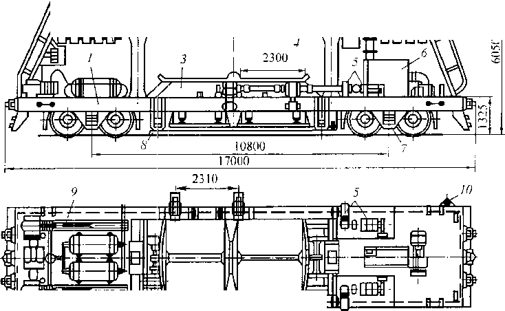 Рудный трансферкар (рис. 4.38) состоит из бункера 1 с порталами 7, двух кабин 2 и 3 управления движением и разгрузкой, рамы 4, специальных тележек 5 с двумя тяговыми двигателями ЭД-107 мощностью по 55 кВт и типового автосцепного устройства 6.