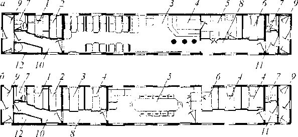 ная; 6 — купе отдыха барменов; 7 — туалет; 8 — большой коридор; 9 — тамбур; К), 11 — малый коридор; 12 — котельное отделение; б — вигони-силопи модели 61-4167: 1 — служебное отделение; 2 — купе проводников; 3 — кухня; 4 — купе; 5 — салон; 6 — кабинет; 7 — туалет; 8 — коридор; 9 — тамбур; К) — коридор косой; 11 — коридор малый; 12 — котельное отделение