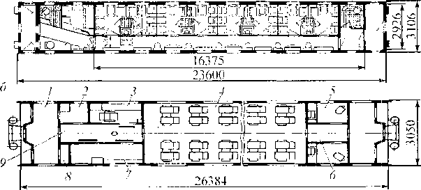 Рис. 5.6. Планировки пассажирских вагонов: а -- с двухместными купе, оборудованными мяг кими спальными местами; 6 --скоростного поезда: / — рабочий тамбур; 2 — система водоснабжения; 3 — купе для проводников; 4 — салон для пассажиров; 5 туалетные о тделения; 6 и 9 - коридоры; 7 - служебное отделение; 8- - внут- ривагонное электрооборудование, сигнализация и радификация