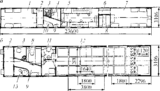 Рис. 5.7. Планировки почтовых вагонов: а— типа ПП; б — типа ПП-1:1 — трактовая кладовая; 2 — тамбур; 3—туалет с душем; 4 — служебное отделение; 5 — зал для сортировки писем; 6 и 9— коридоры; 7—транзитная кладовая; 8 — купе для отдыха бригад; 10 и 13 — котельное отделение; 11- помещение для оператора; 12 — багажная кладовая