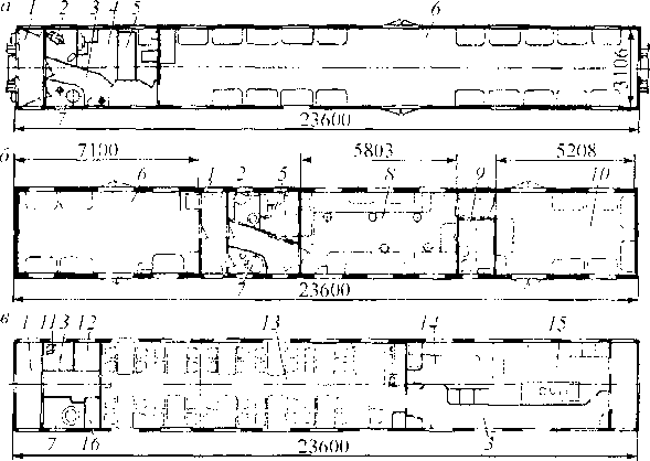 Рис. 5.8. Планировки пассажирских вагонов вспомогательного назначения: а — багажного; б — багажно-почтового; в — вагона-ресторана: } — тамбур; 2 — туалет с душем; 3 — коридор; 4 — служебное отделение; 5 --- купе для раздатчиков багажа; 6 — багажная кладовая; 7 — котельное отделение; 8 — сортировочный зал; 9 — купе для о тдыха бригады; 10 — кладовая для почты; II — умывальное отделение; 12 — помещение для обслуживающего персонала; 13 — обеденный салон на 48 мест; 14 — буфетное отделение; 15 -- кухня; 16 — кладовая для продуктов