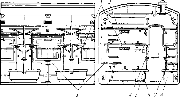 Внутреннее обустройство пассажирских вагонов выполняется в зависимости от типа, назначения и планировки кузова. Оно состоит из комплекса помещений и обустройств, создающих максимальные удобства и комфорт пассажирам в пути следования. Все эти помещения имеют соответствующее оборудование. Каждое из отделений, предназначенных для пассажиров некупейного спального вагона (рис. 5.11), имеет шесть спальных мест или девять мест для сидения. Для этих целей оно оборудовано двумя поперечными 5 и одним продольным 8 диванами, двумя поперечными У и одной продольной спальными полками. Над спальными полками жестко укреплены полки для багажа 2, а под поперечными диванами устроены рундуки 6 для ручной клади. У окна между поперечными диванами укреплен откидной столик 3. На торцевых частях перегородок, разделяющих отделения друг от друга, устроены ступеньки и поручни 4, используемые при подъеме пассажира на верхние спальные места. Над каждым диваном на перегородках размещены газетные сетки, брюкодержатели, крючки-вешалки, державки для матрацев. На потолке установлены дефлекторы и решетки для подачи воздуха в помещение из воздушного канала принудительной вентиляции, а также светильники с люминесцентными лампами. Продольный диван сборный, состоящий из двух боковых сидений 8 и средней откидной части 7, которая поворачивается на шарнирах кронштейна и закрепляется на зацепы, установленные на подоконном брусе. Установка откидной средней части в нижнее положение позволяет образовать сплошную нижнюю спальную полку или в поднятом положении два места для сидения и столик между ними под окном. Верхняя продольная спальная полка подвешена на тягах, в дневное время суток ее можно убрать вверх под багажную полку.