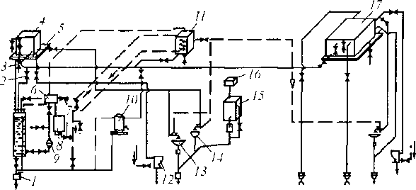 Рис. 5.16. Схема установки для охлаждения питьевой воды: 1 — ниша; 2 — водоразборный крап; 3 — воздушная труба; 4 — бак кипяченой воды; 5 — переливная труба; 6 — бак охлажденной воды; 7 — термостат; 8 — испаритель; 9—сливной кран; 10 — автоматический регулирующий вентиль; 1 / — фильтр; 12 — запорный вентиль; 13 — ресивер; 14 — электронагреватель; 15 — вентилятор; 16 — конденсатор; 17 — холодильный агрегат; 18 -- компрессор; 19—всасывающий вентиль;