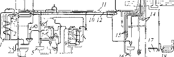 установлен промывной бак объемом 50 л, в который вода поступает из больших баков по трубе 77. В этой системе вода нагревается в специальном бойлере 7 змеевиком 2, соединенным системой труб и кранов с котлом отопления. Температура воды в бойлере контролируется с помощью
