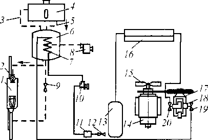 Из компрессора 18 газообразный хладагент через нагнетательный вентиль 20 поступает в конденсатор 16 и переходит в жидкое состояние. Из конденсатора он через ресивер /2, запорный вентиль /2, фильтр 11 и автоматический регулирующий вентиль 10 компрессором 18 нагнетается в испаритель 8.
