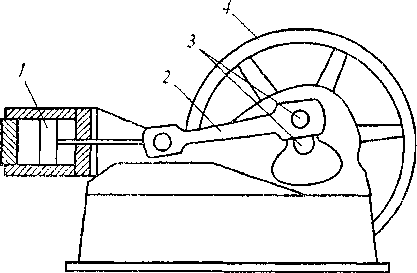 Рис. 6.2. Схема паровой машины: У- - поршень; 2 — шатун; 3 — коленчатый вал; 4 — маховик
