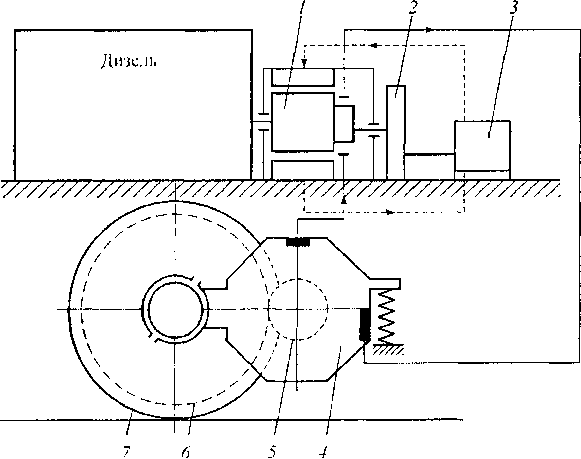 При электрической передаче (рис. 6.9) коленчатый вал дизеля вращает вал тягового генератора 1. Генератор вырабатывает электрическую энергию, которая приводит в действие тяговые электродвигатели 4, расположенные на колесных парах 7.