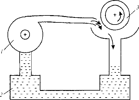Гидропередача (рис. 6.10) работает следующим образом. Вал центробежного насоса 1 получает вращение от вала дизеля, засасывает жидкость из камеры 2 и подает ее к турбинному колесу 3, вал которого связан с колесными парами. Жидкость из турбины снова попадает в камеру 2 и повторяет свой путь.