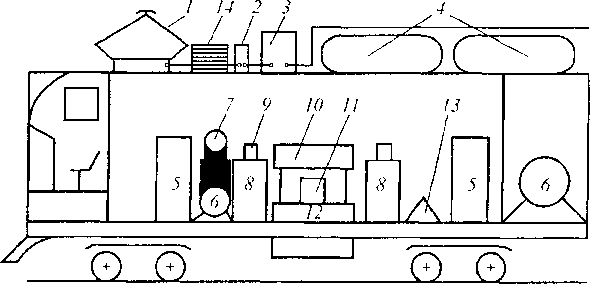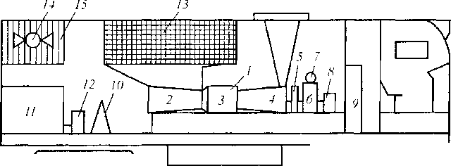 | Рис. 6.16. Схема газотурбовоза Г1-01: 1 — ГТД; 2 — компрессор; 3 — камера сгорания; 4 —- газовая турбина; 5 — распределительный редуктор; 6— тяговый генератор; 7— вспомогательный генератор; 8 — возбудитель; 9 — аппаратная камера; 10—мотор-компрессор; 11 — вспомогательный ДВС; 12 — генератор; 13— кассеты воздушных фильтров компрессоров; 14 — вентилятор холодильника; 15 — масляные радиаторы |