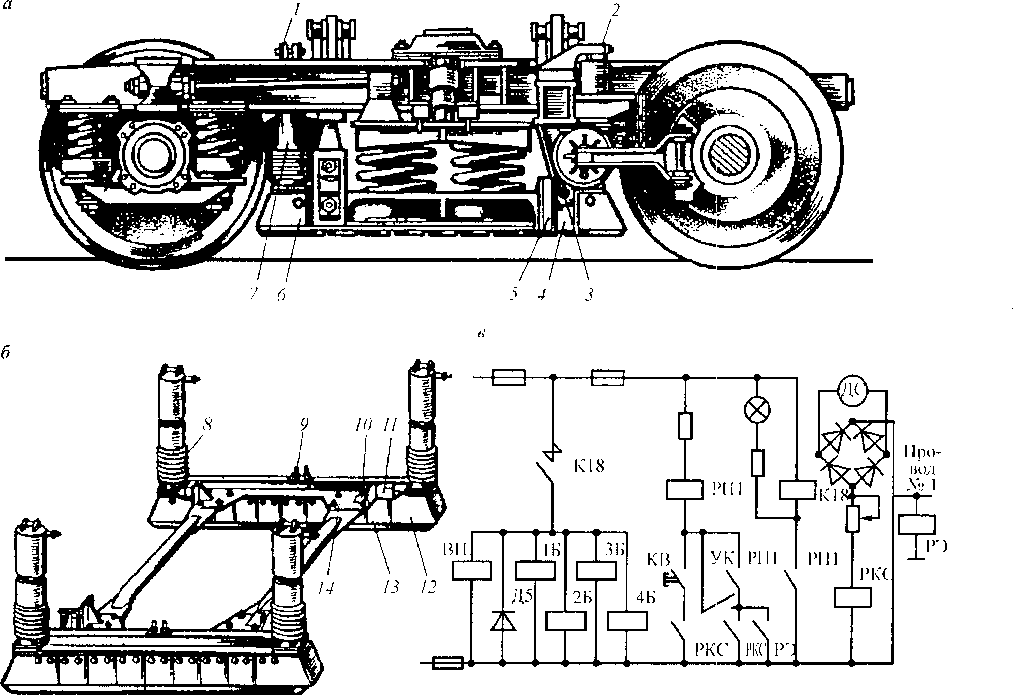 Рис. 7.16. Электромагнитный рельсовый тормоз: а — расположение тормоза на тележке; б — расположение тормозных башмаков; в — 'электрическая схема