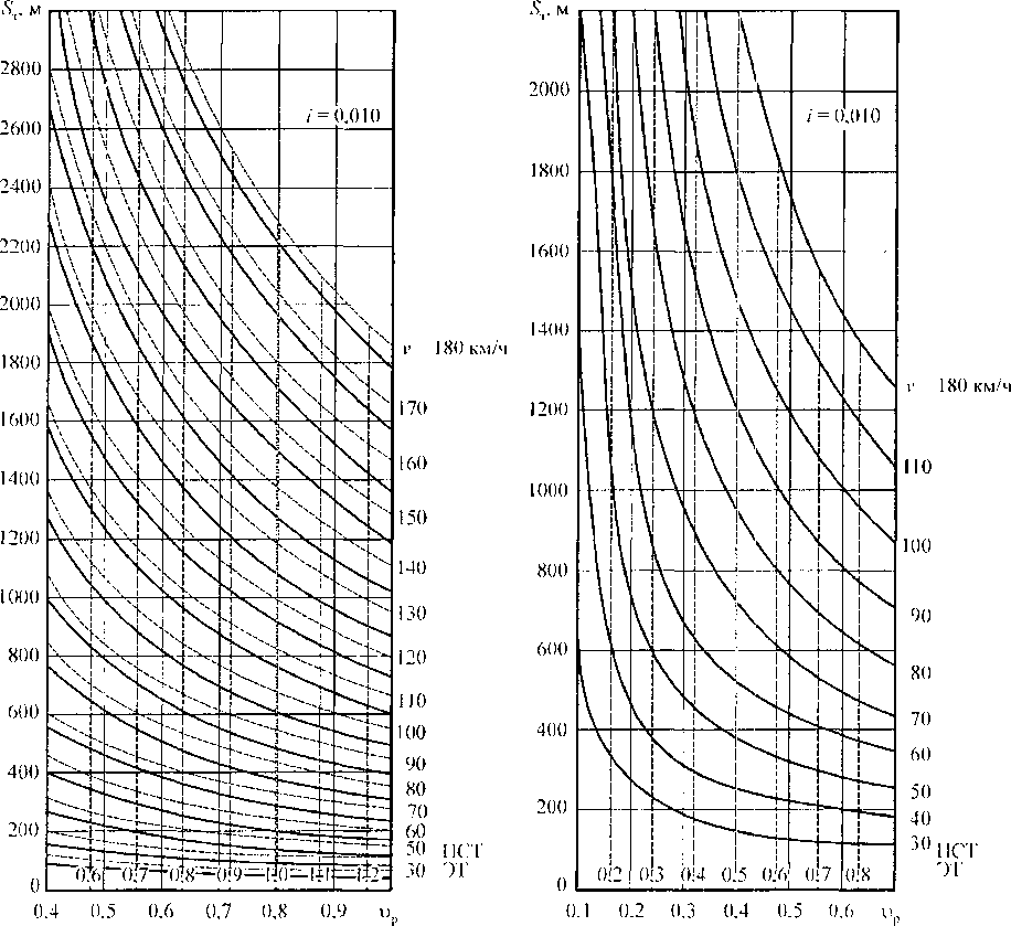 На рис. 7.17 для примера показаны номограммы тормозного пути для пассажирского и грузового поездов (длиной до 200 осей).