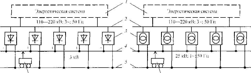 На электрифицированных отечественных железных дорогах применяются две системы электрической тяги: постоянного тока с номинальным напряжением в тяговой сети 3 кВ и переменного однофазного тока промышленной частоты (50 Гц) с номинальным напряжением 25 кВ. Однако и в том, и в другом случаях в подвижном составе используют тяговые двигатели постоянного тока. Электро- подвижной состав электрифицированных железных дорог получает электроэнергию от энергосистемы общего пользования. Принципиальная схема систем питания электрифицированных железных дорог приведена на рис. 8.2.