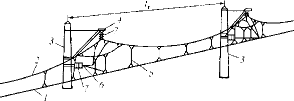 Рис. 8.4. Контактная сеть: I — контактный провод; 2 — несущий трос; 3 — опора; 4 — консоль; 5 — струна; 6 — фикса гор; изолятор; / - длина пролета