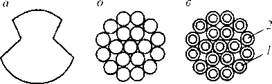 | Рис. 8.6. Профили проводов контактной сети: а — контактный провод; б— многопроволочные провода; в —биметаллический провод; г — сталеалюминиевый провод; / — стальная сердцевина; 2 — слой меди; 3 — алюминиевые проволоки |