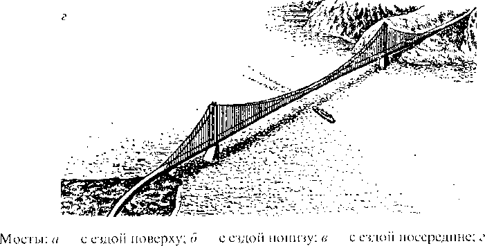 При расположении проезжей части моста на уровне верхнего пояса фермы мост называется с «ездой поверху» (рис. 9.6, а); при расположении на уровне нижнего пояса — «с ездой понизу» (рис. 9.6, б). Мост с ездой посередине показан на рис. 9.6, в, а висячий мост — на рис. 9.6, г.
