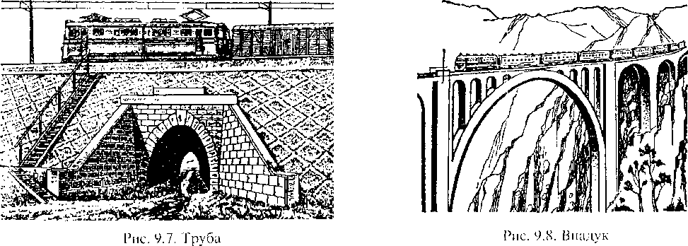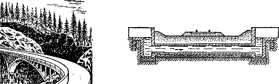 Вместо высоких насыпей строятся также мосты-эстакады и акведуки (рис. 9.9), т.е. мосты с лотками под водоток (оросительный канал, водопровод). Для пропуска малых водотоков, например оросительных каналов, под путем в неглубоких выемках делают дюкеры (рис. 9.10) с колодцами по его концам. На крутых косогорах, а также у берегов рек и морей строятся подпорные стенки из камня, бетона, железобетона. Они могут быть монолитными или сборными (из свай, стоек, плит).